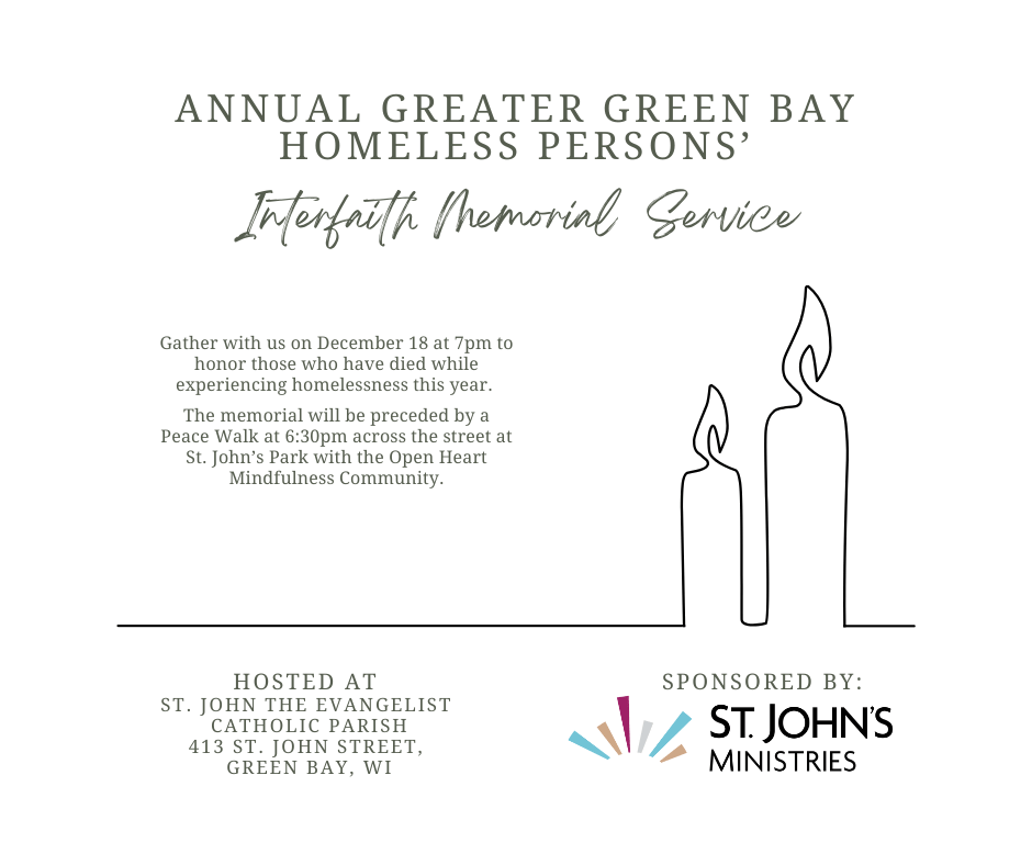 We invite you to join us for a candlelit walk of peace before the Homeless Persons’ Interfaith Memorial Service 6:30 PM on Thursday, December 18th at St. John the Evangelist, 413 St. John St, Green Bay.